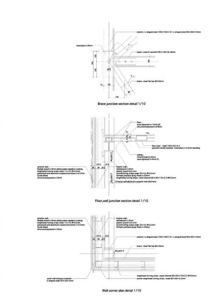 The space of around the house is useful to let light and wind in. The wall of the rooms borders the outside, so I put windows in the best position that harmonizing with its surroundings. And the window is so big against the small room, every time the window opens or closes, the inside view dramatically changes. Especially, at the second and third floor there is a large hinged door each room, if it is opened, the inside of the room is enveloped in light and wind as if you are outside. By making the thin floor boards for connecting with their life and making the large windows what are opened toward the city, I aimed to exceed the segmentation, for example the up stair and the down stair, the inside and the outside, a building and the town, etc… to broaden the whole image of a house.