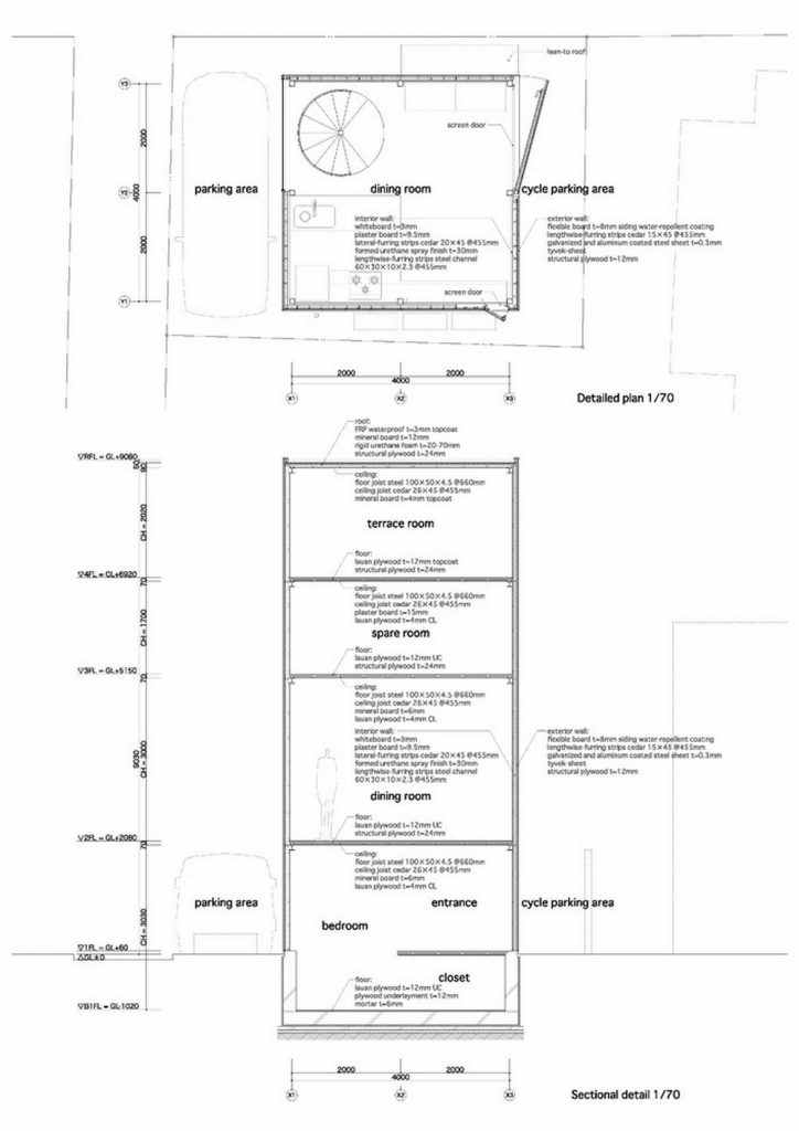 The small house which the married couple and their child live stands at the densely populated area in Tokyo. Though the neighboring houses is very close, I aimed to design the house which exceed the physical narrowness living at the city. I laid out the 4m×4m building that as small as I can at the center of site area 34m2 and made some space for flowing of light and wind around it. And by making the space, it’s possible to avoid setback regulation and it has the 9m high volume like a tower. The inside is simple structure what is separated by the 4 floor boards and is jointed by spiral stairway. Especially, by making some extremely thin floor boards (thickness 70mm) , the up and down floor boards got close and connected the whole space of the house without a break.