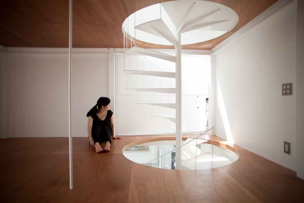 One of the focal points of the house’s interiors is a circular white staircase. This leads to three levels up, and one level down.