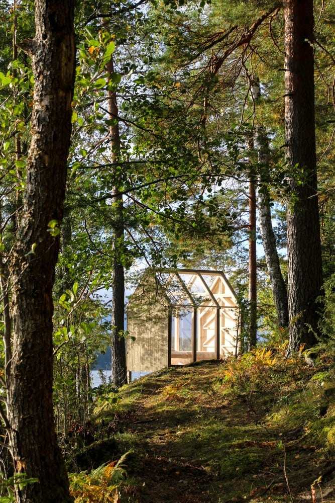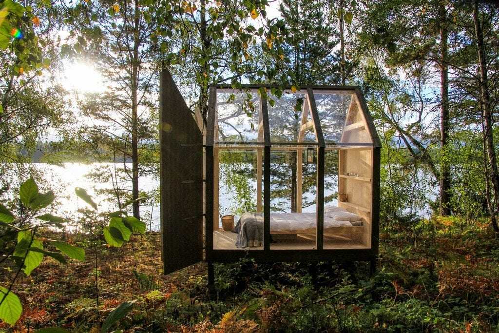 The cabin is off the grid, located in the wilderness. It’s very small in size with nothing but a bed, built-in shelves, and a light source. But the surrounding landscape makes up for whatever is missing. Glass walls and ceiling panels allow unfiltered and unrestricted views of the outdoors.