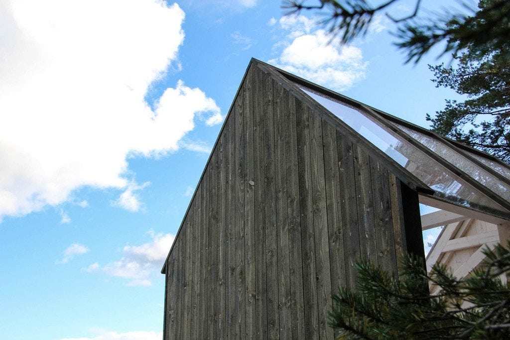 All boards – the ones on the walls as well as the floor – are set a few millimetres apart from each other, partly because of the movements within the material, and partly because it filters the sunlight in a beautiful way but mostly the reason for this is ventilation. Since there is so much glass the temperature could be very high when the sun is up but because the cabins are well ventilated the indoor temperature rarely differs much from the outdoor climate. Besides, this is not a place for daytime activity – this is the place you curl up a night to look at the stars.
