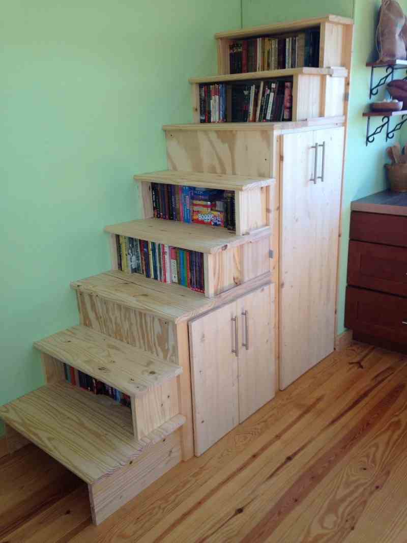 Under the stairs that go to the loft, we built in book shelves and kitchen storage. We also built a book shelf in the bedroom, above the doors and window, that wraps around 3 walls. The closet/laundry area serves as the hallway from the living area to the bedroom and bath. We have two dogs and their beds fit nicely in the hall area.