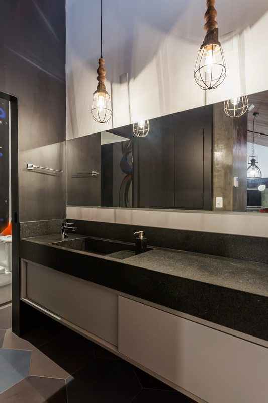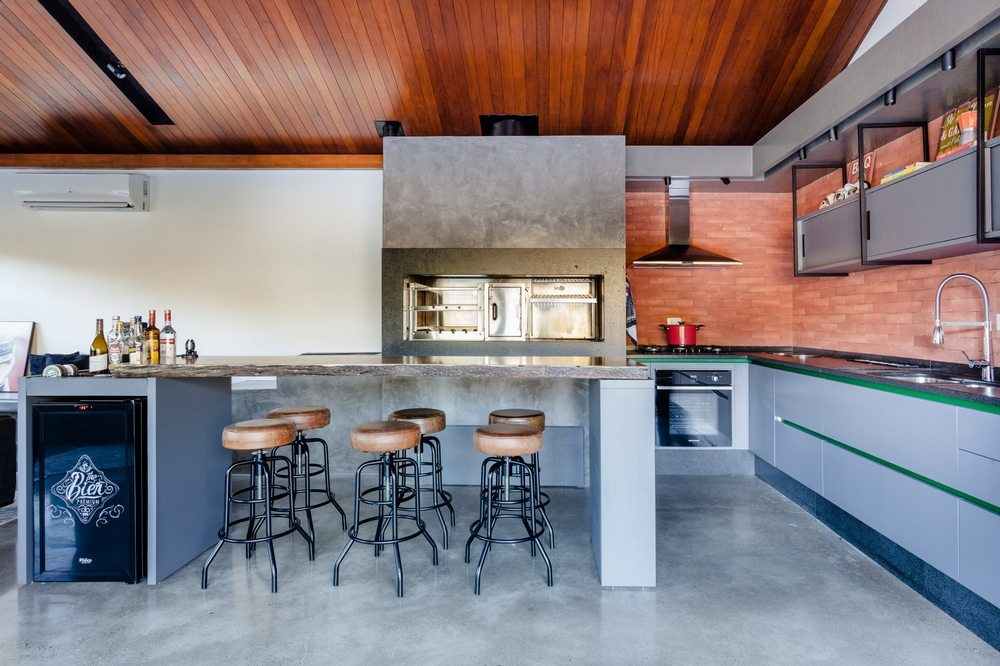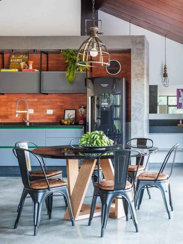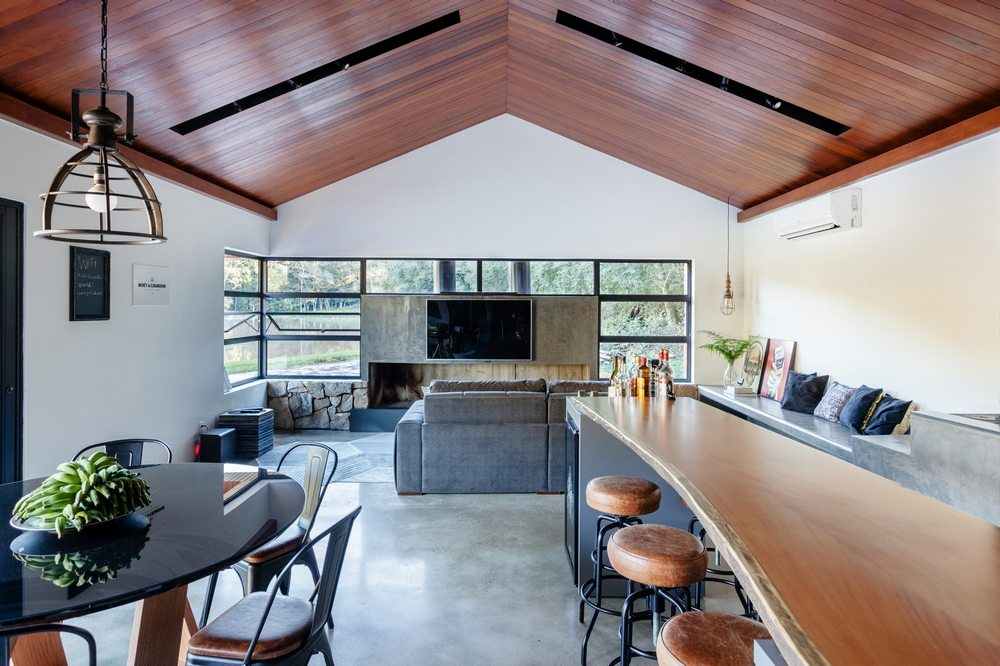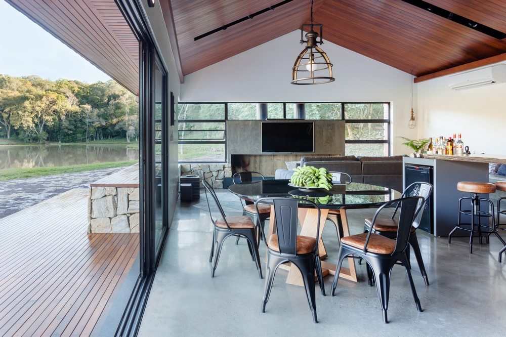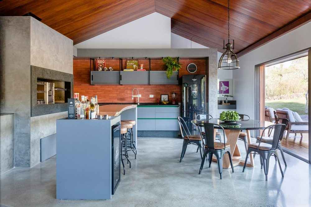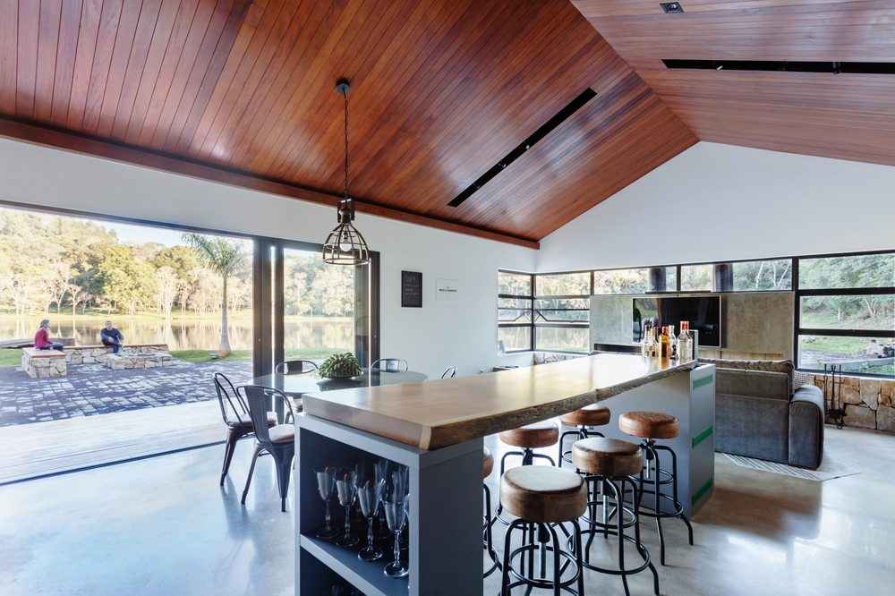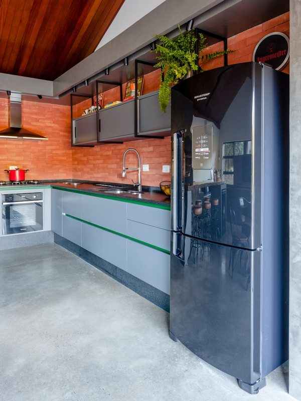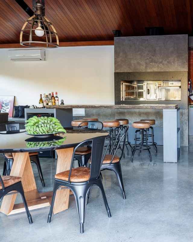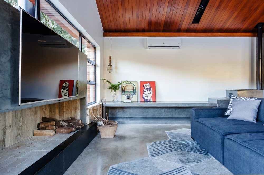 The interior space has a fireplace with 3m long thought due to the climate of the place that is quite cold and humid, as it is located 500m altitude in the middle of the closed forest. The decor followed the industrial style and transformed the house into a rustic contemporary space. In the kitchen area, the lighting was made on rails with spots and the structures that house the cabinets have black metallic tubes. The apparent wood, combined with the burnt cement of the floor, gave warmth and warmth to the environment.