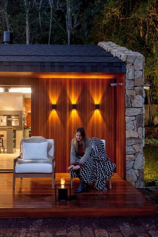 In the external area, we interfered as little as possible, because the objective was to maintain the more natural and organic air that the property possesses, using only parallelepiped marking the accesses. The only element designed was a sitting near the lake, with decking bench and a floor grill also used as fireplace.