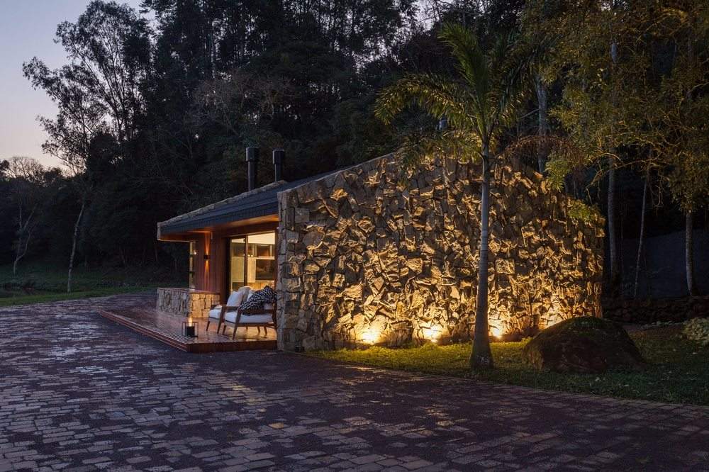 The nature of the place and the rustic style were the inspiration for the design of the hut where we used a lot of wood and Jacarandá stones in their raw state, that is, without mortar between them reminiscent of the taipas existing in the place.