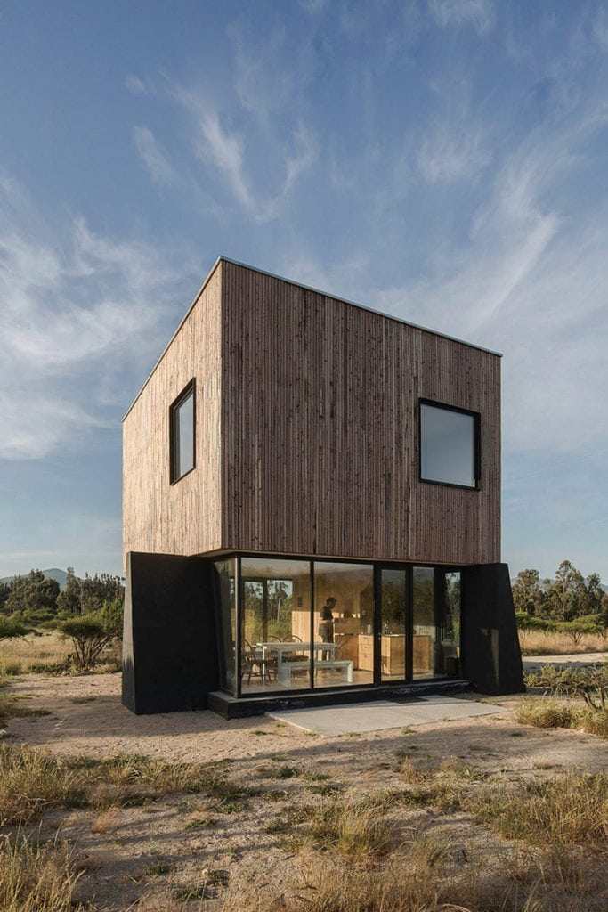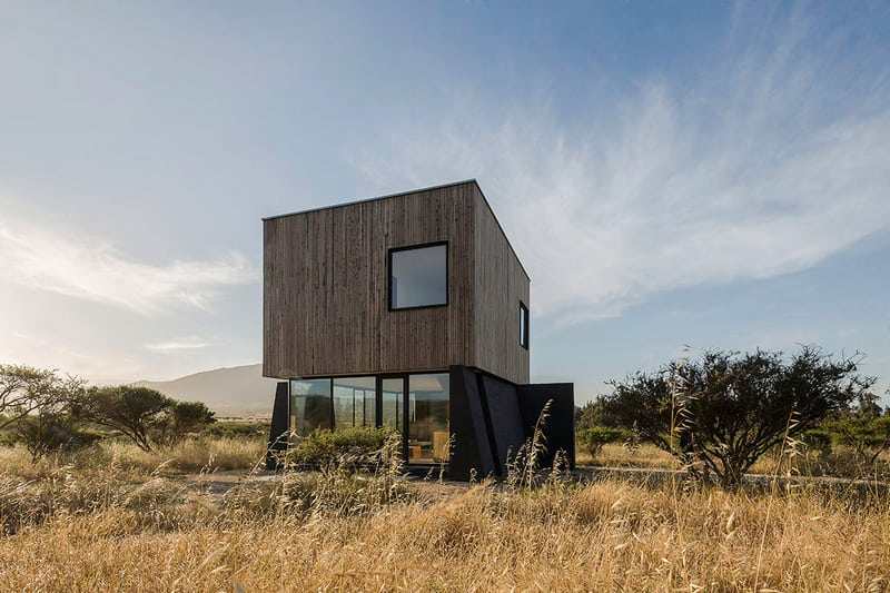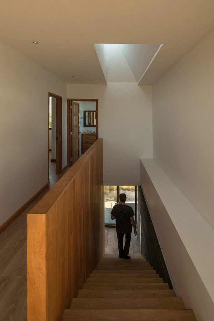 Natural sunlight filters in through a single skylight at the rooftop. Downstairs, there is ample light, thanks to all-glass walls. A door leads to the outdoors, a semi-arid landscape with stunning views around.