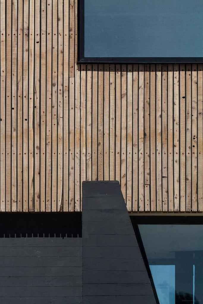 The house features a lounge and kitchen on the first level. Upstairs are two bedrooms and a restroom. The lower level of the house is clad in glass, creating an indoor/outdoor living space. In contrast, the second level is clad in timber panels, providing the house more privacy.