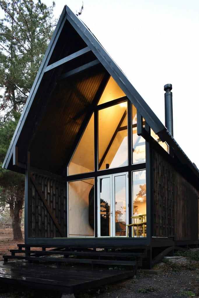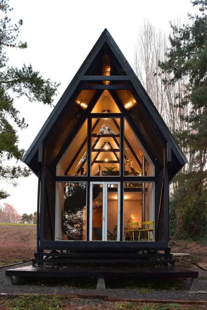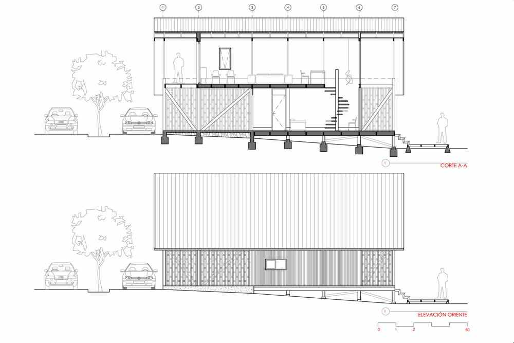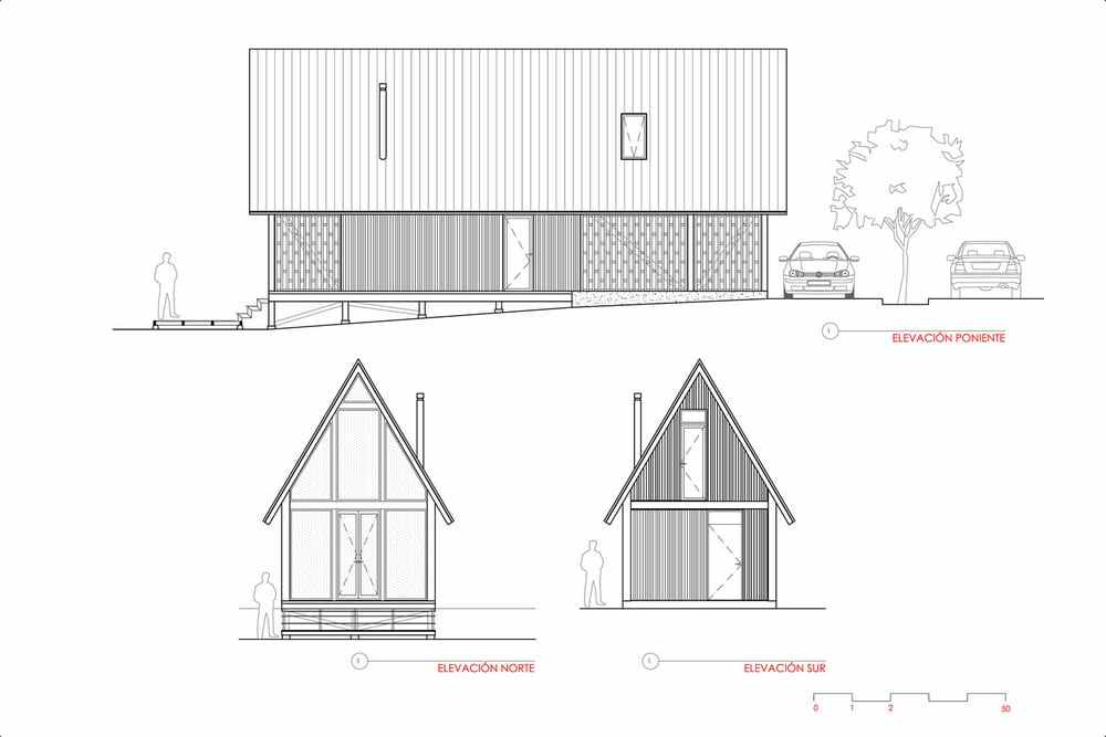 This cabin is elevated from the ground, has slopes on the terraces and two floors. The slopes dialogue with the naturalness of the terrain, in order to reduce costs in foundations and radiers. The roof also has a steep slope to protect it from snowfals in the winter.