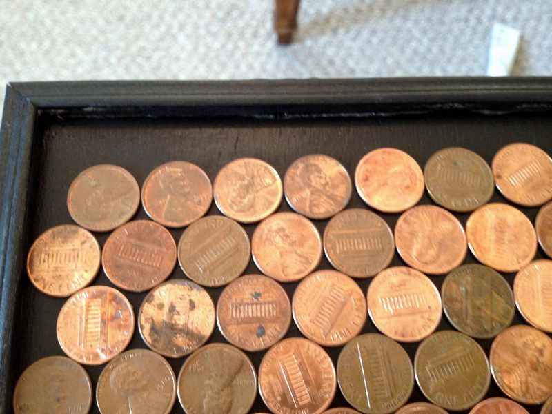 • After all the pennies are glued and the glue has dried, it’s time to seal them in. Brush on a layer of ultra gloss glaze. Let it set, then apply another layer for good measure.