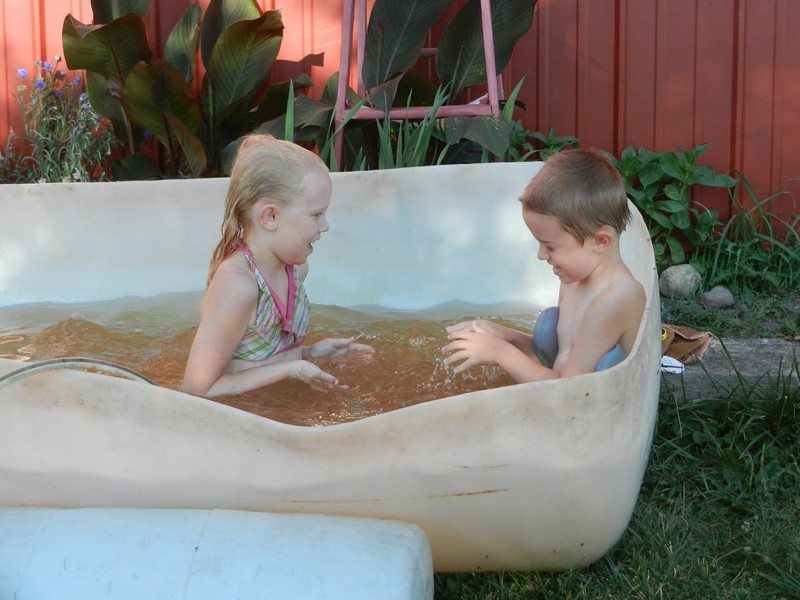 A makeshift swimming pool is very popular in plastic water games, like water balloon fights, but this setup is not suited for real-life swimming.