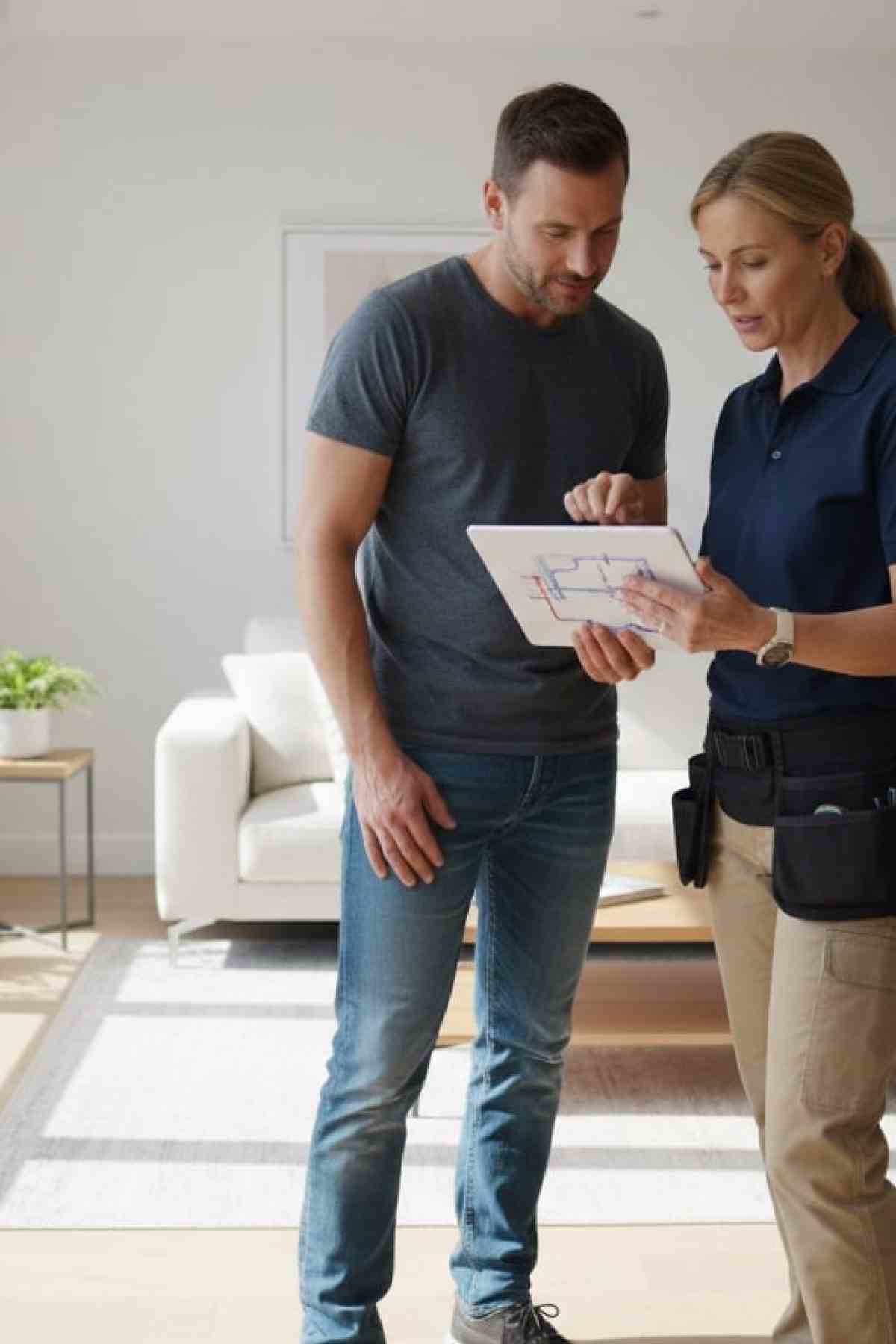 A homeowner and electrician standing together in a modern living room, reviewing a wiring diagram on a tablet