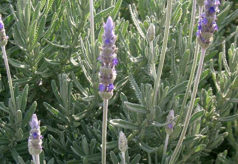 French lavender (Lavandula dentata) – strangely, a native to Spain. This variety, so named because of its fringed leaves, grows to about a metre high with a similar width. The branches are very upright and woody. The foliage is a lovely silver grey, with the flowers tending to be more blueish, however both pink and white flowering varieties are common.