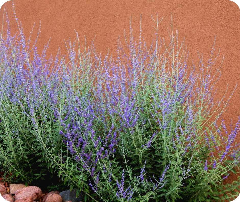 - Russian Sage – 3–5 ft tall; full sun; dry, well-drained soil; very drought tolerant