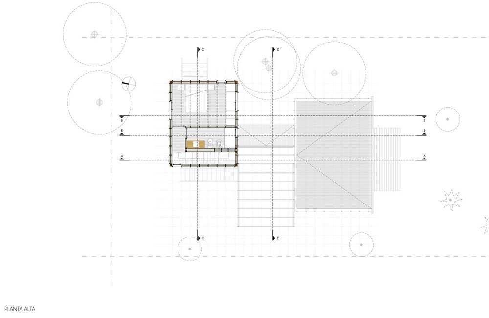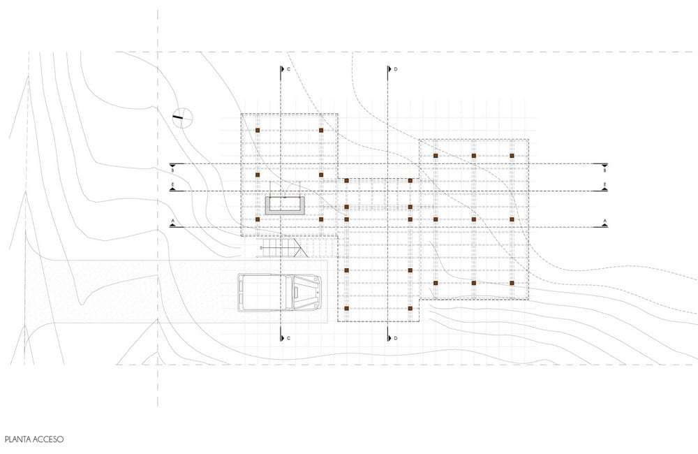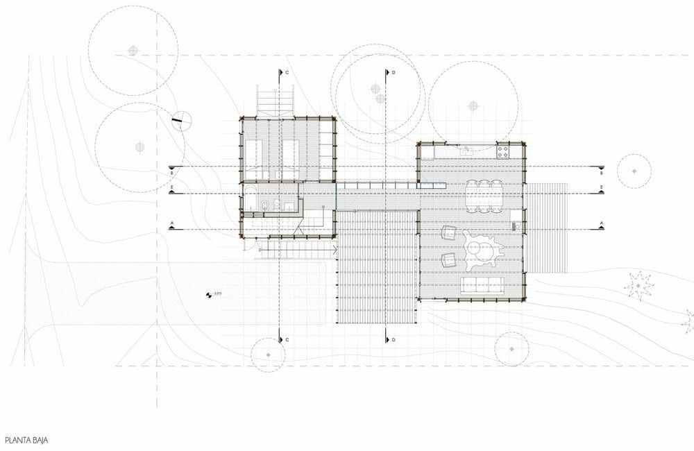 Located in La Juanita beach, in a forest enclave near Jose Ignacio lake, the lot where the house is built presents a steep slope with a height difference of eight feet between the front that faces the street and the back. Given this disposition, the house’s ground level is projected above the maximum height of the land, detached, maintaining the natural slope and ensuring ventilation to the lower structural parts.