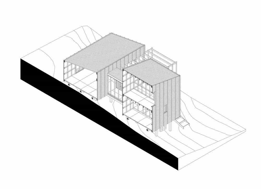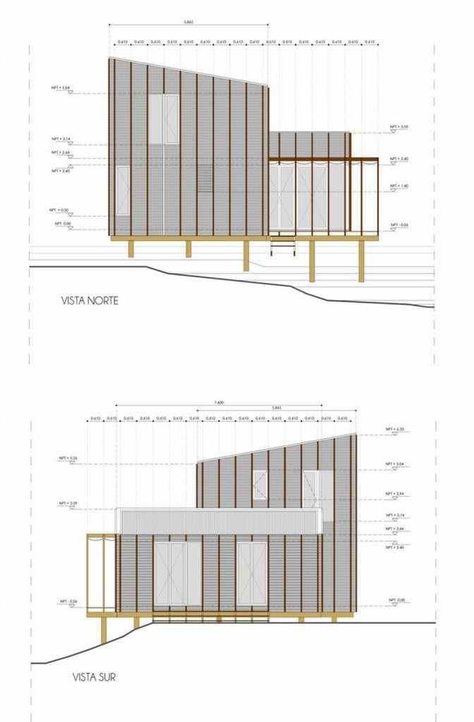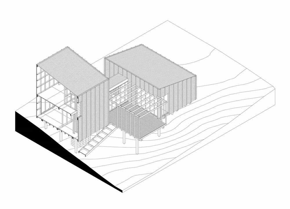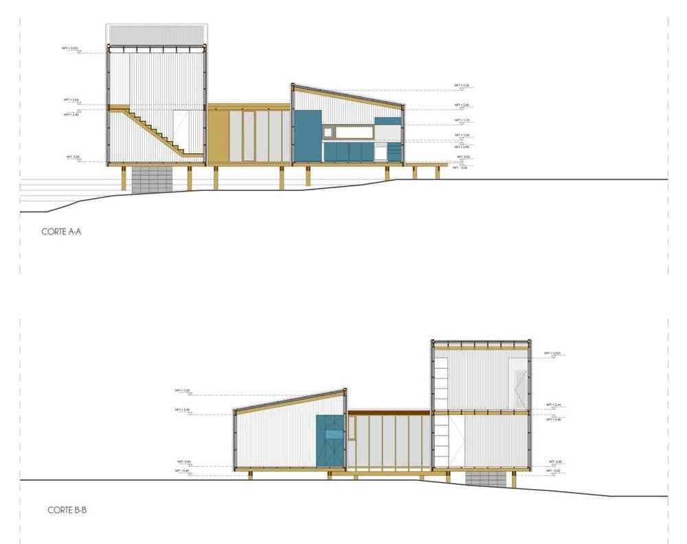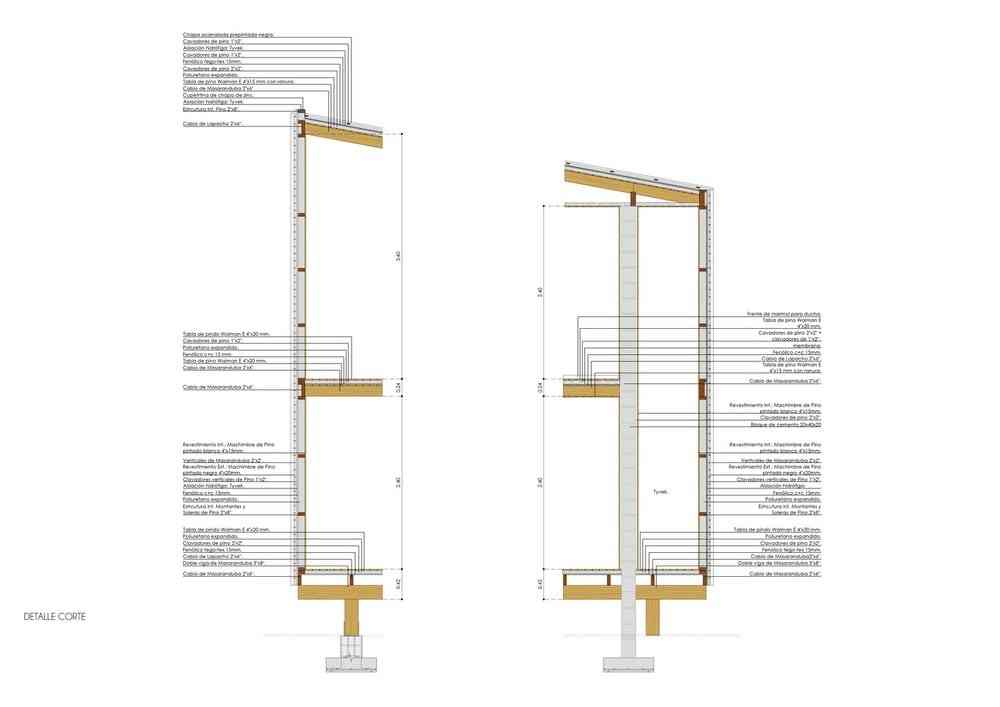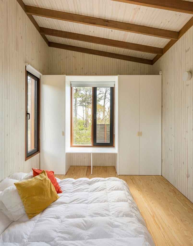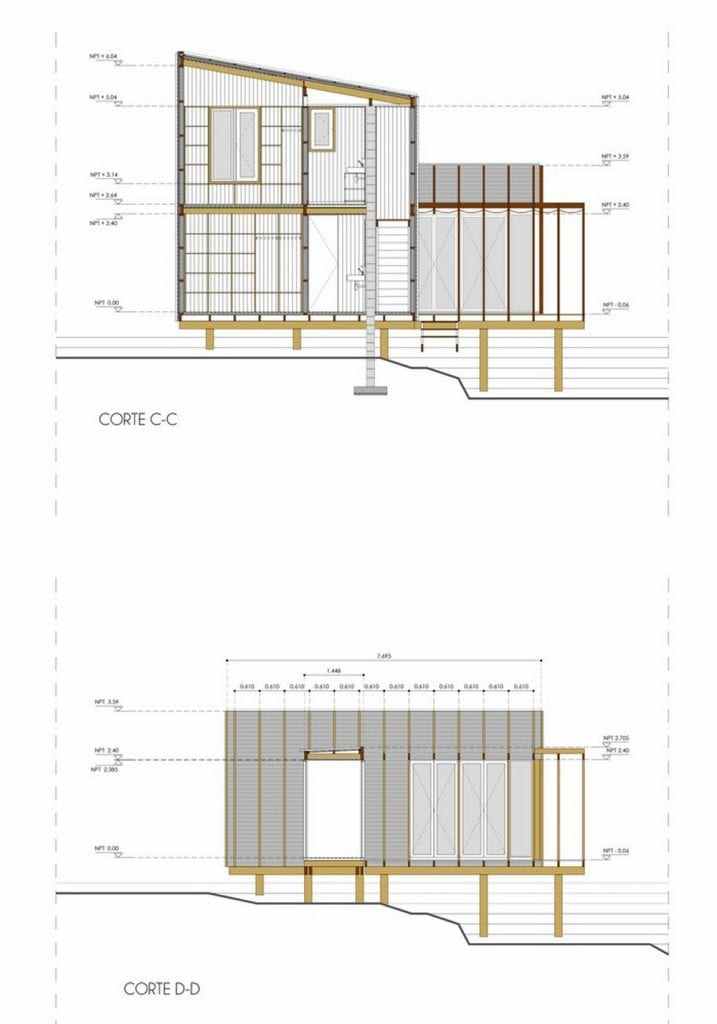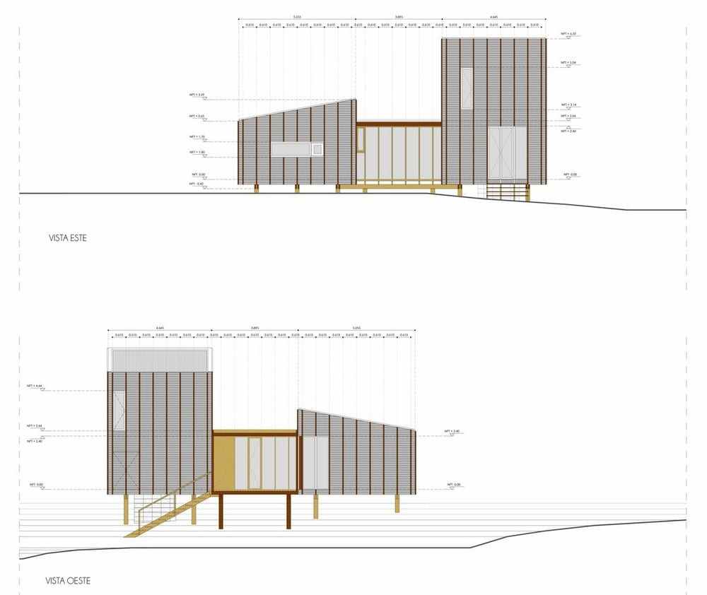 With the exception of the foundations, the construction was made entirely in wood, combining the use of harder species for structural parts and in contact with the exterior and softer types for the assembly of interior partitions and coatings. A set of hardwood verticals arranged every 2 feet guarantees the rigidity of the exterior coating of pine tree dyed in oil. In this way, the external language embodies the direct expression of constructive and material modulation.