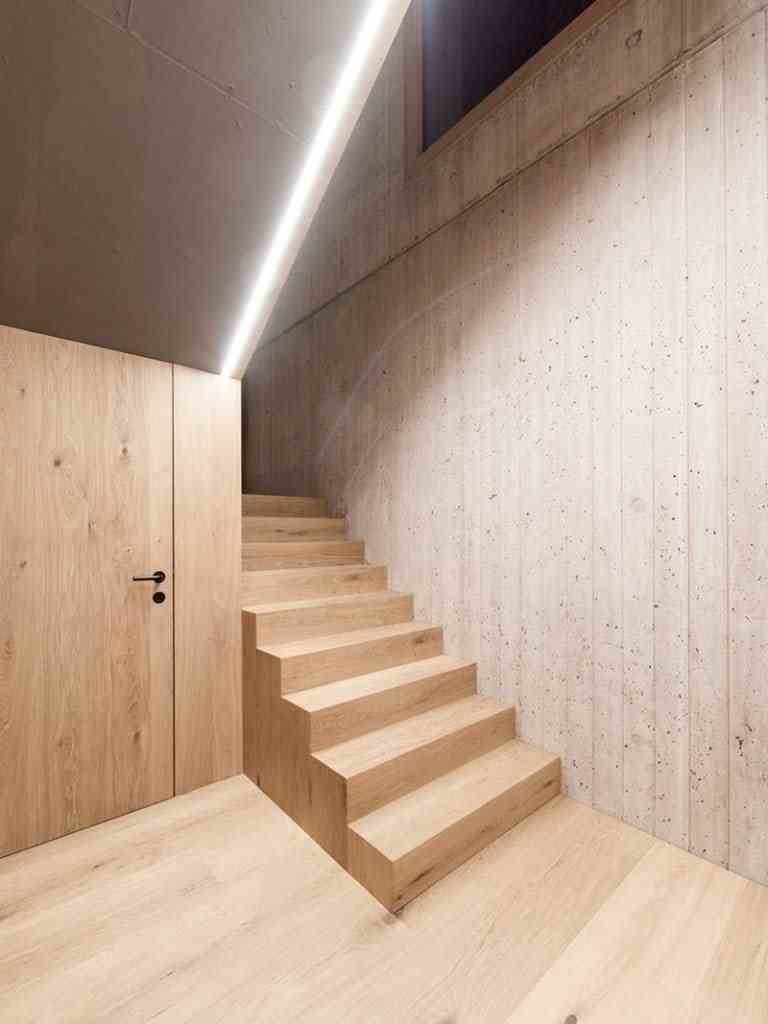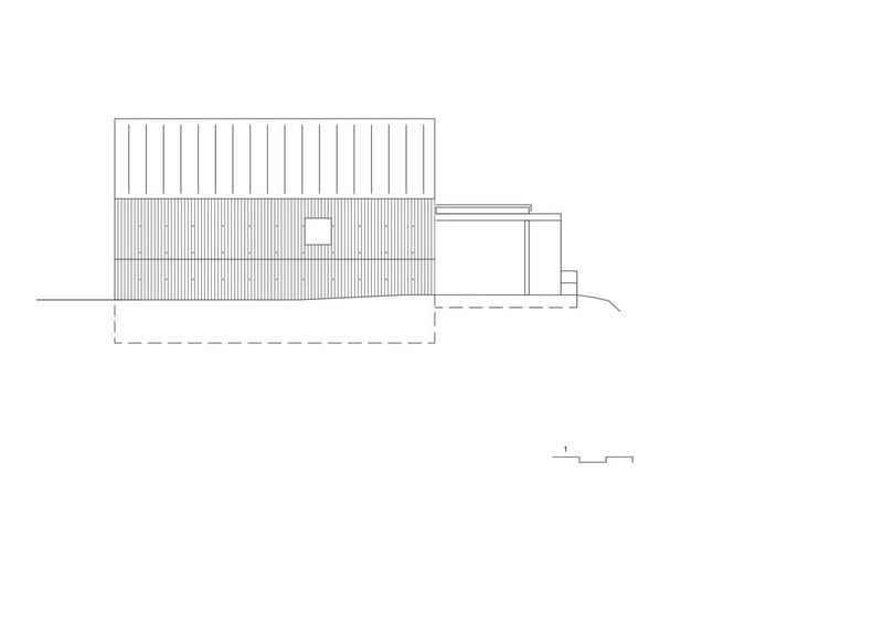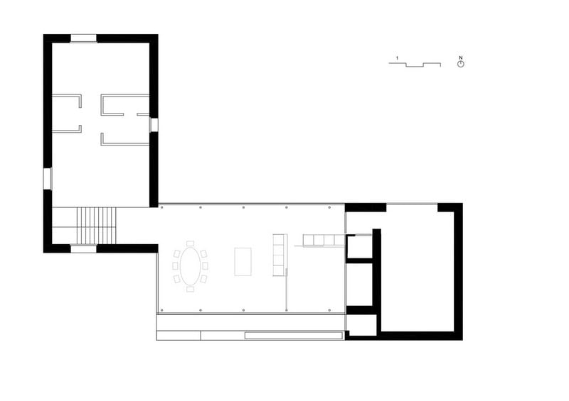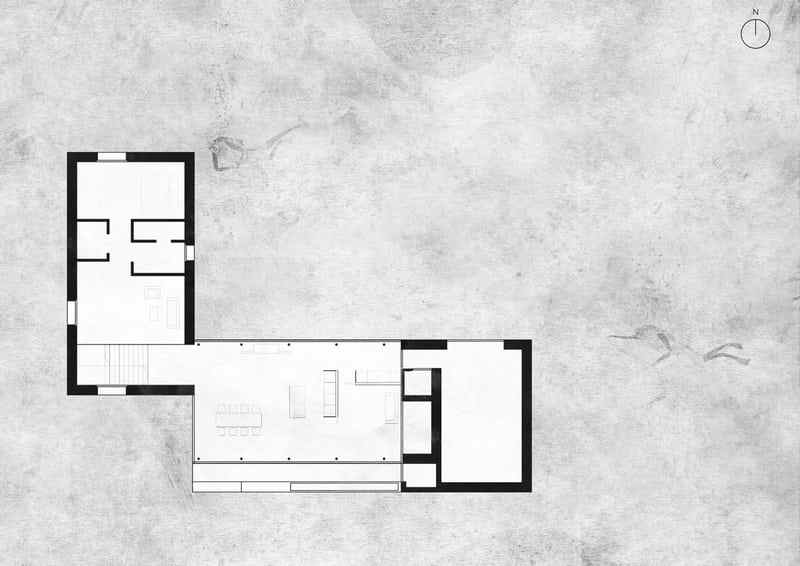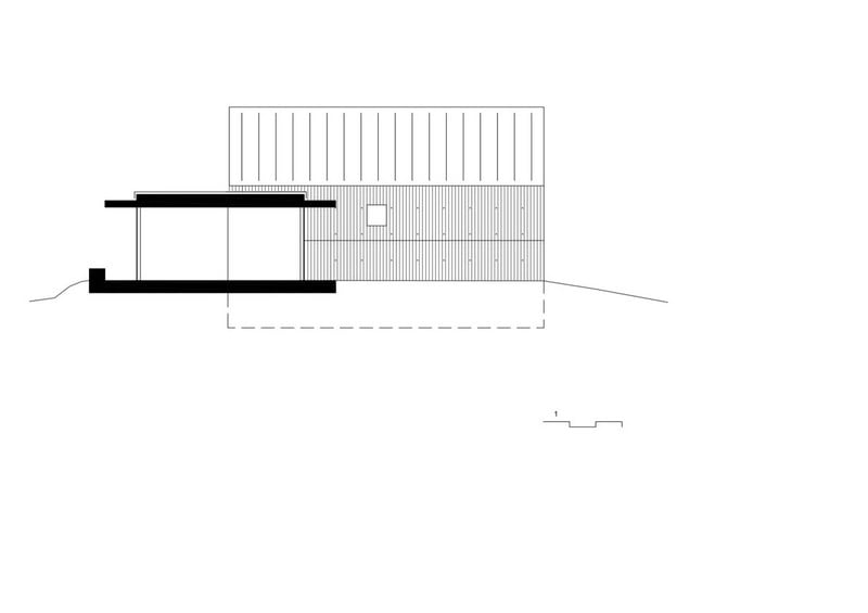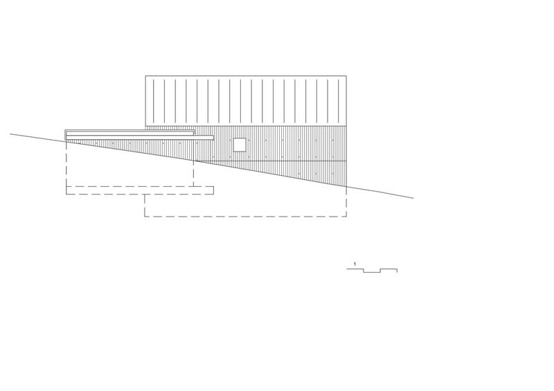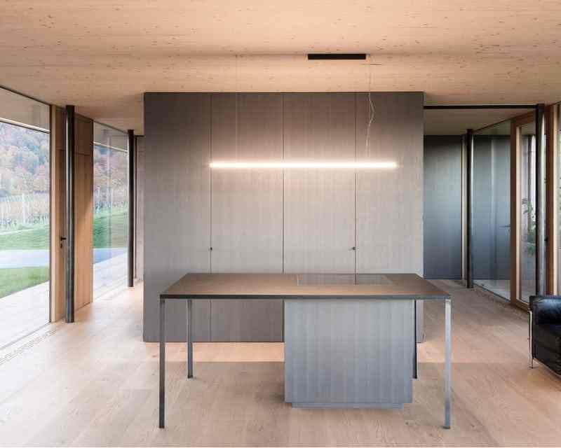 Accordingly, inside the sleeping and wet area and a gallery as a retreat. The brown color and the haptic texture of the concrete walls convey comfort and only occasionally reproduce selected image details of the 360 degree panorama through the wide wooden frames of the windows. on the east side of the building, orthogonally adjoins a flat, elongated structure that integrates the living, dining and cooking areas as well as the garage.