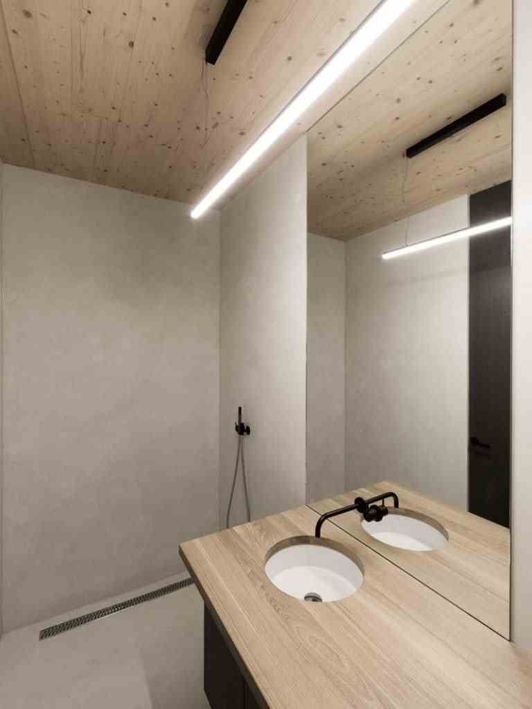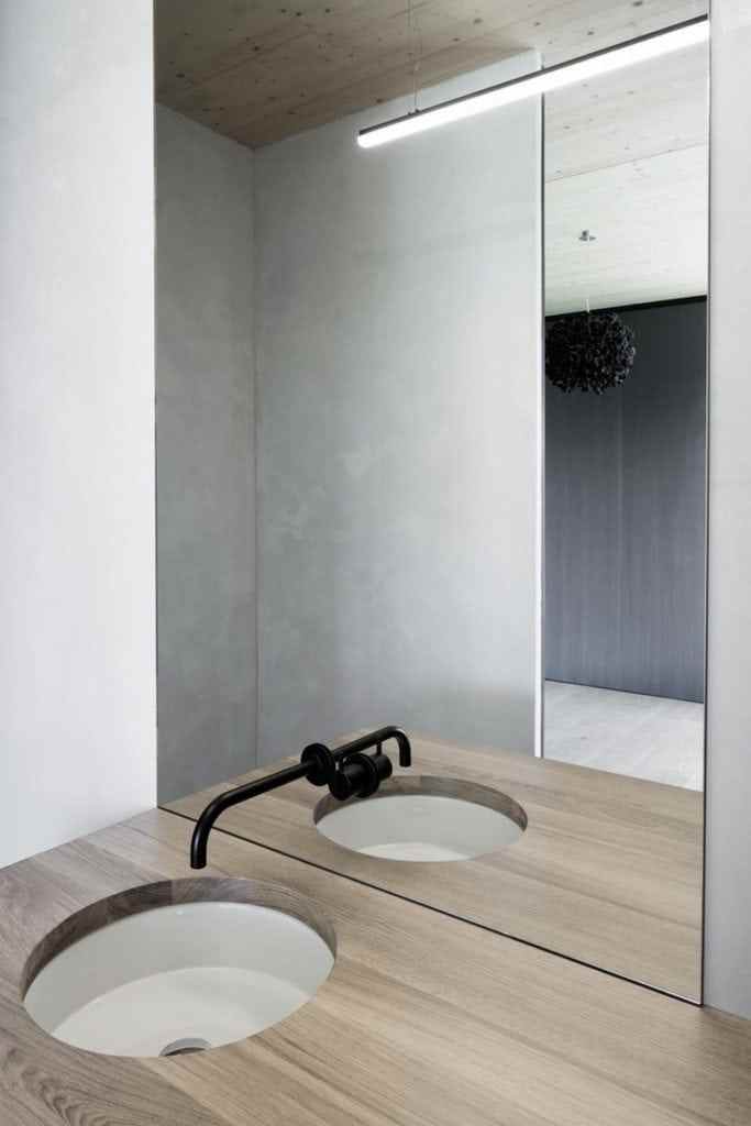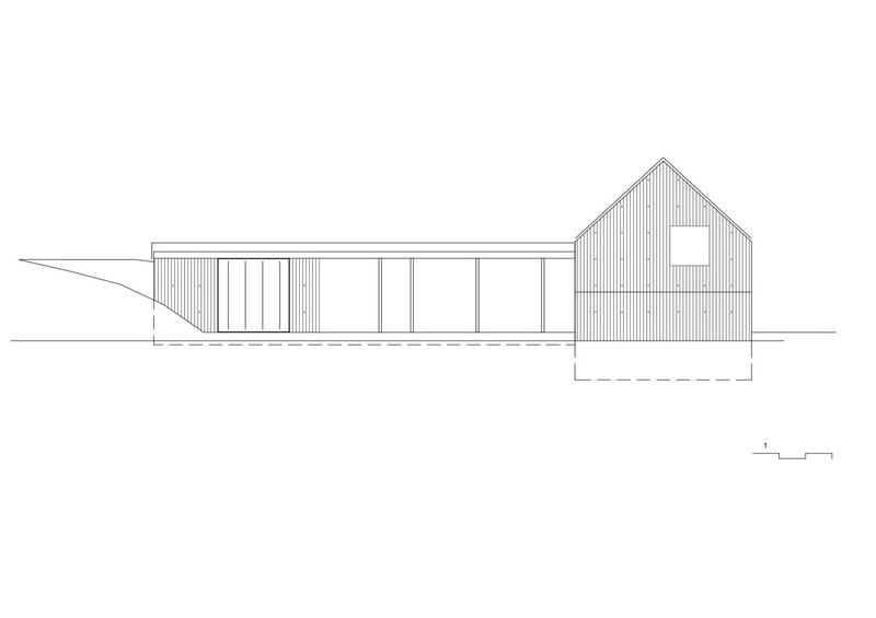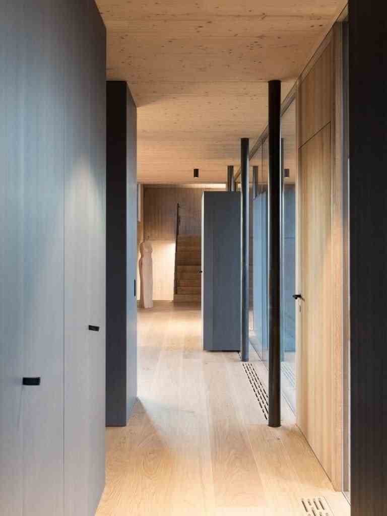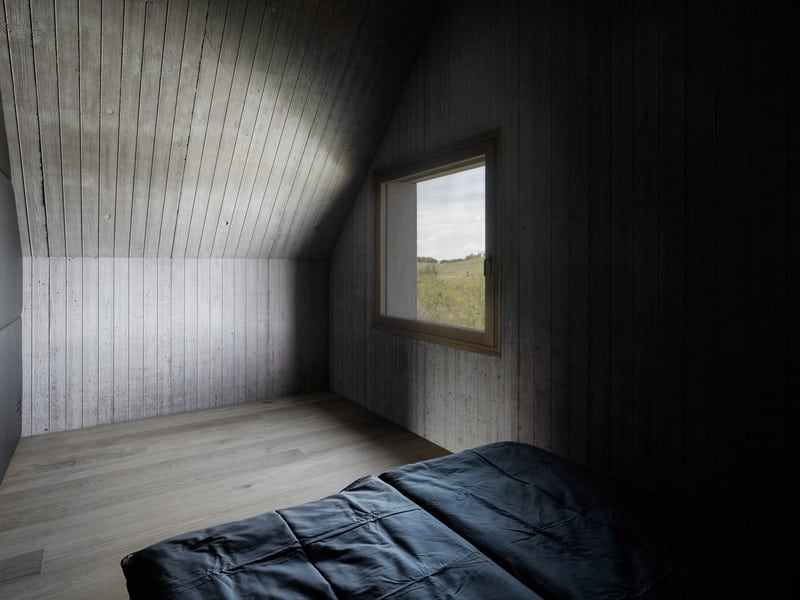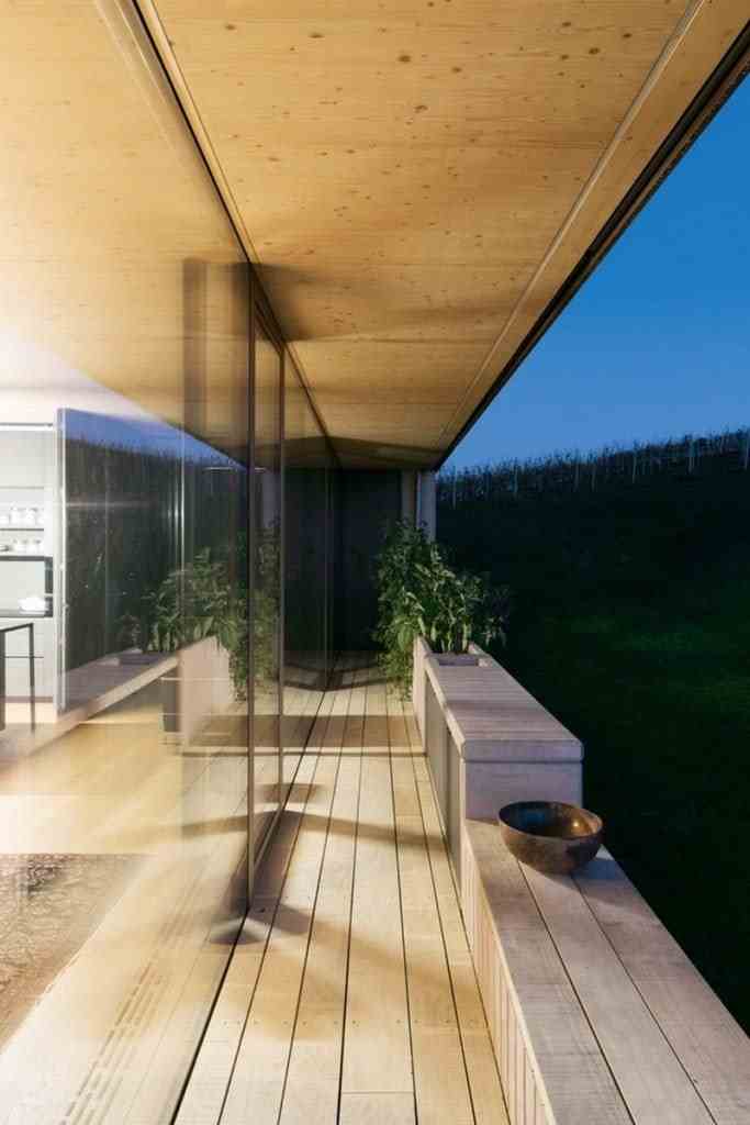 Accordingly, inside the sleeping and wet area and a gallery as a retreat. The brown color and the haptic texture of the concrete walls convey comfort and only occasionally reproduce selected image details of the 360 degree panorama through the wide wooden frames of the windows. on the east side of the building, orthogonally adjoins a flat, elongated structure that integrates the living, dining and cooking areas as well as the garage.
