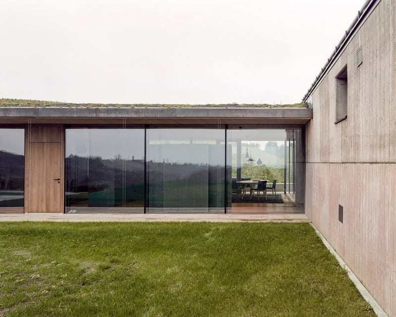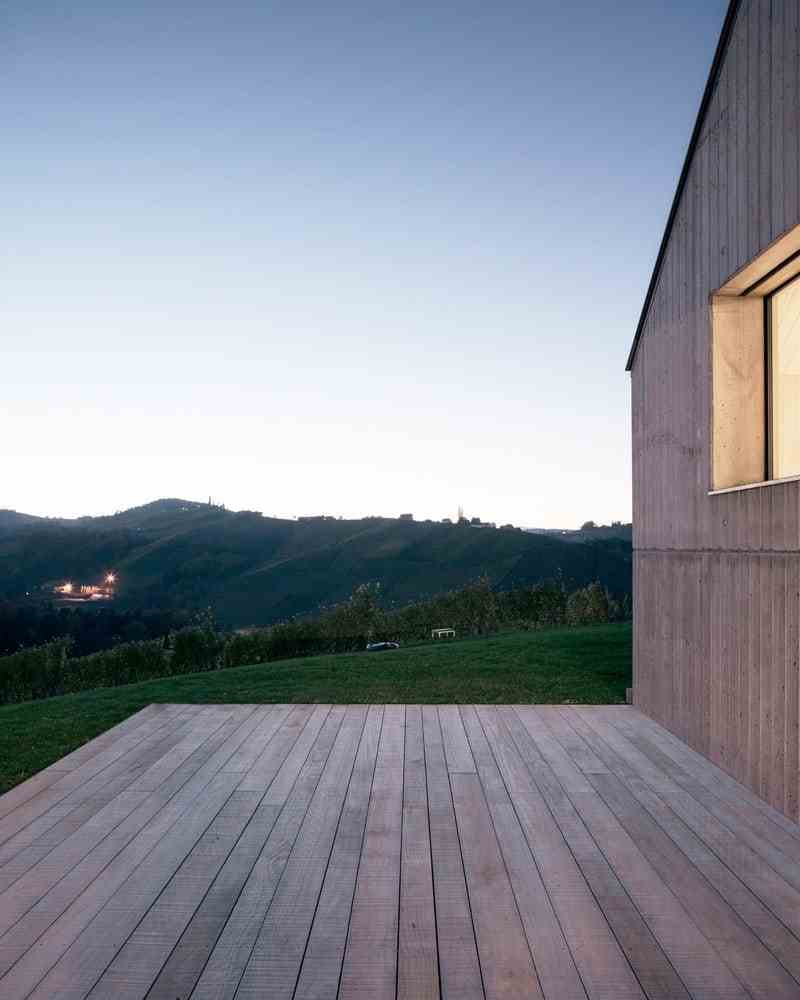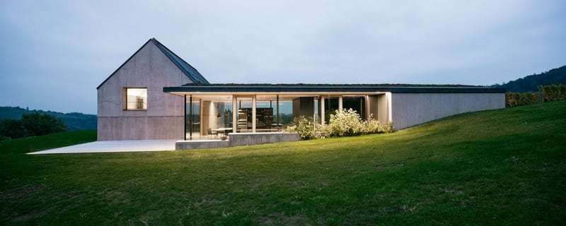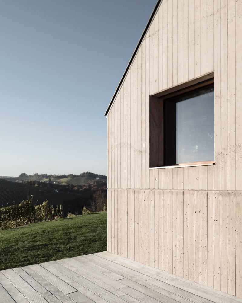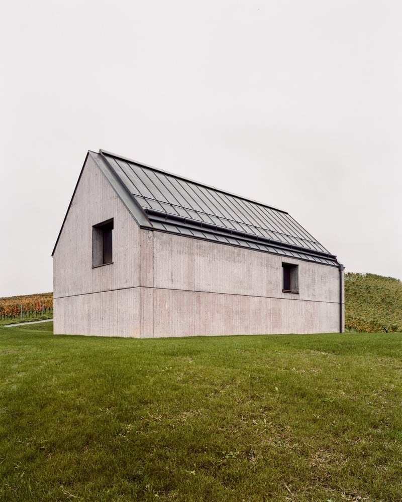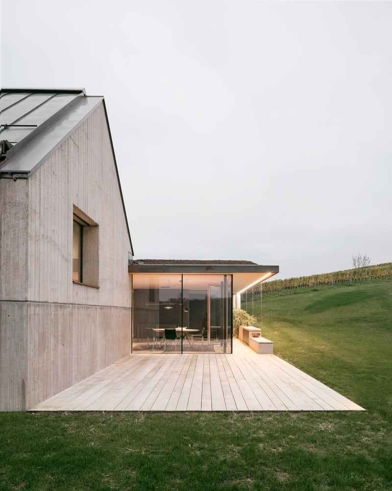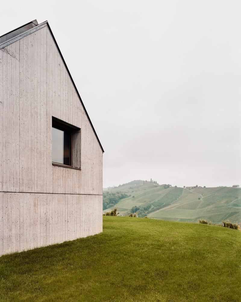 Nestled in a gentle hilly landscape, the house naturally integrates into the surrounding vineyards of the hilltop. Despite the exposed location, it forms a unity with the landscape due to the materiality and its formal restraint and sits self-confidently, looking at the gable towards the valley, on a slope.