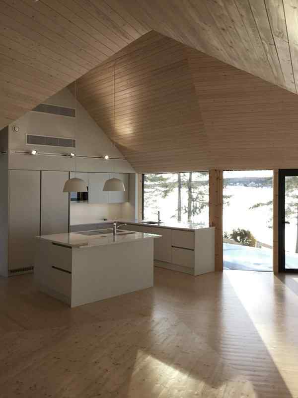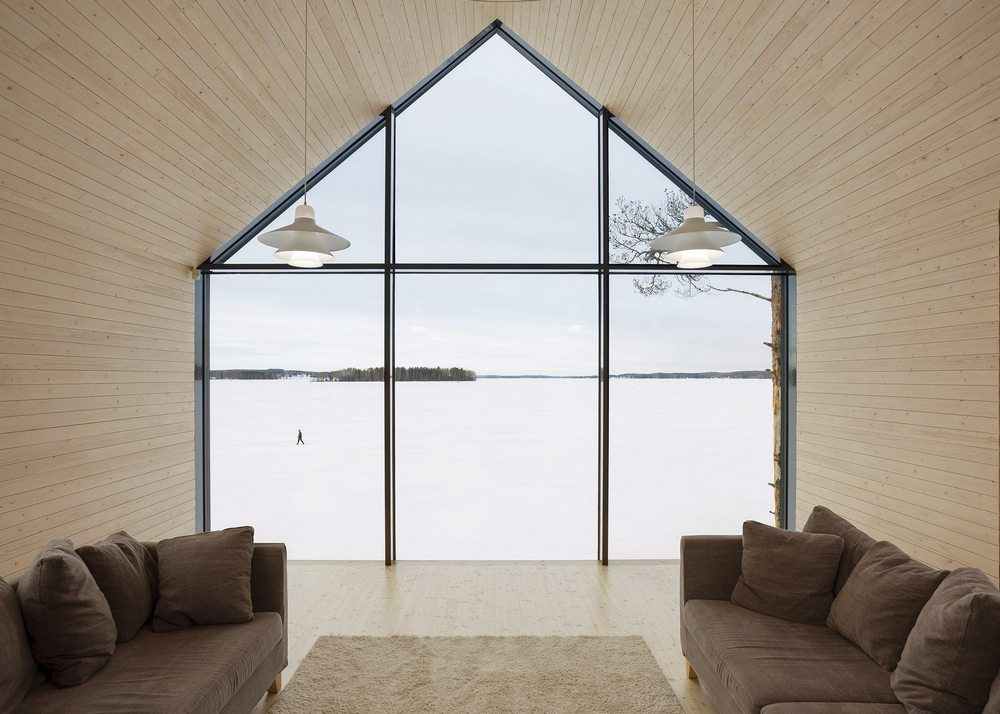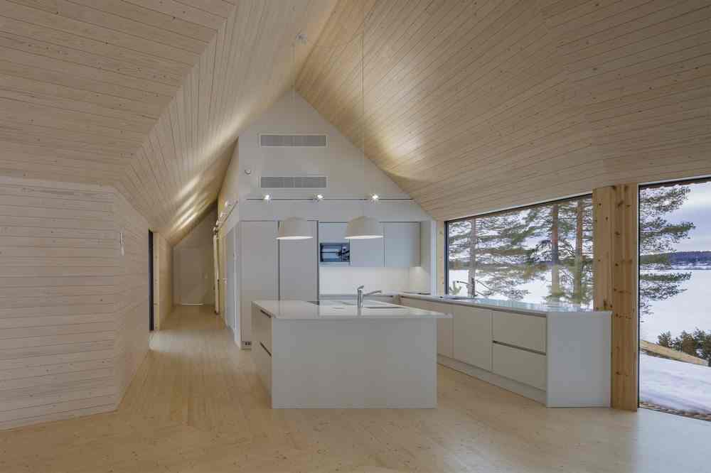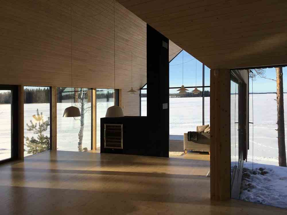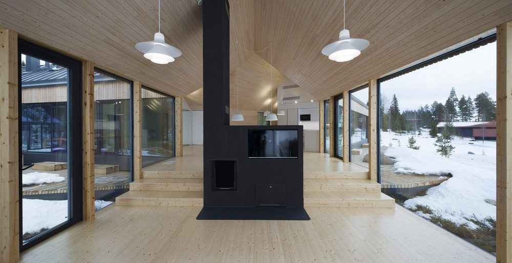 The interiors are clad with a subtly whitened spruce to enhance the experience of the scenery. The concept of three inter-joined wings and extensive use of glass create a spatial flow inside the house. The cell like spaces of the bathrooms and bedrooms are introduced into the open interior space as boxes made of white plywood. This was done to enhance the illusion of an old barn that has been converted into a contemporary house. Finally, as a traditional focal point in a home, a large black fireplace acts as the centerpiece of the interior.