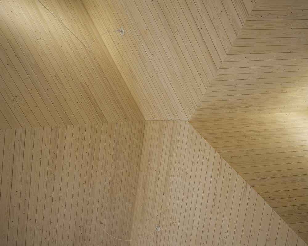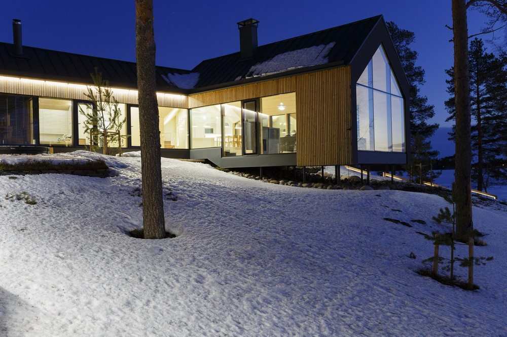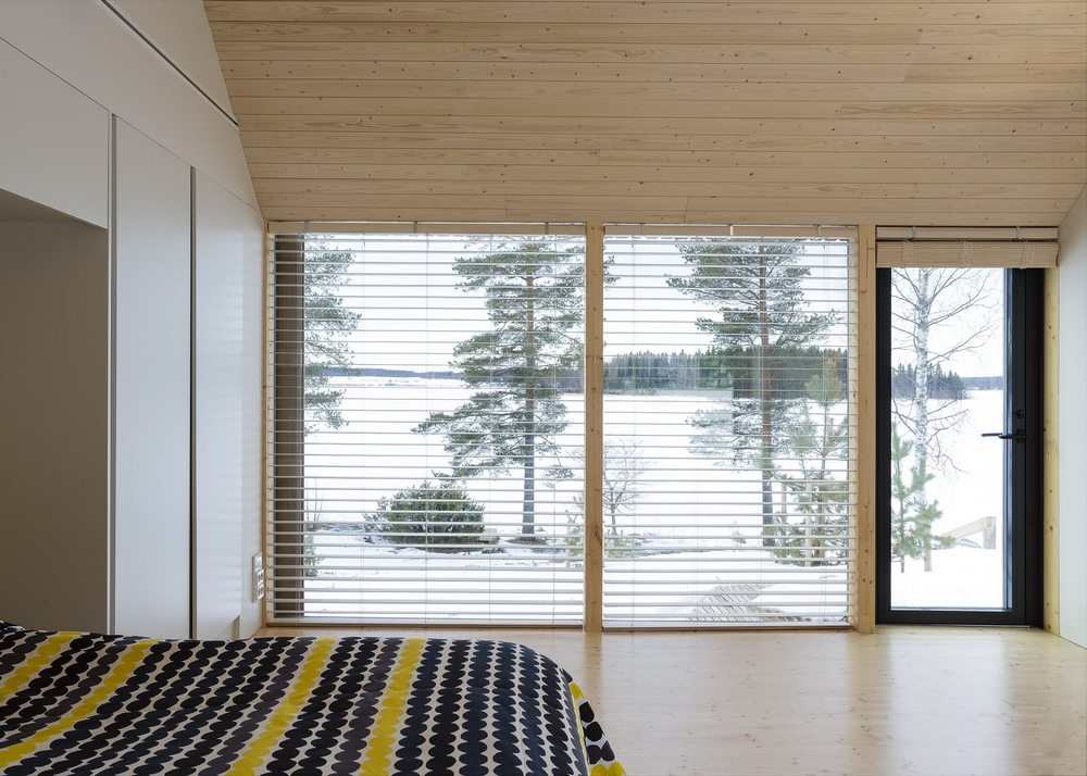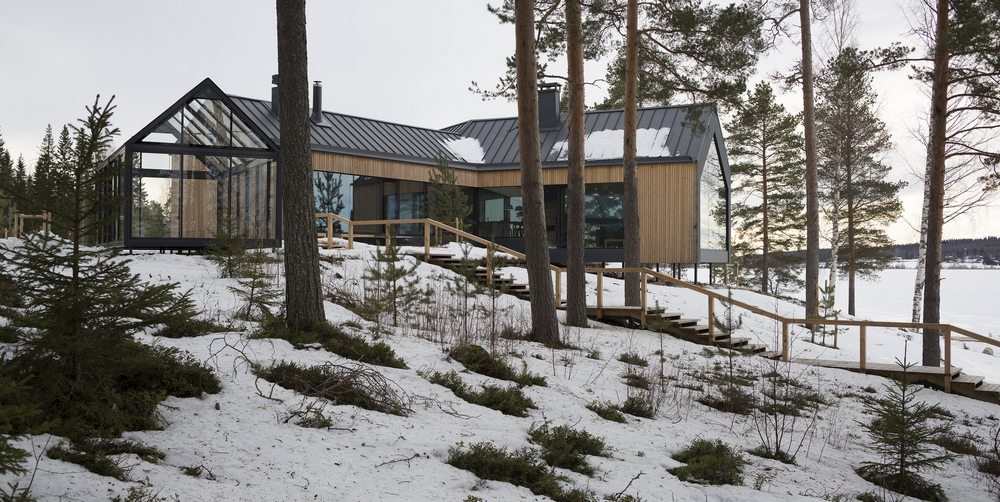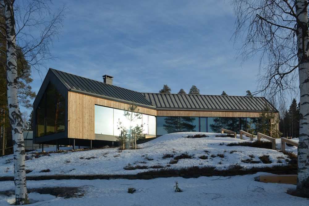 The interiors are clad with a subtly whitened spruce to enhance the experience of the scenery. The concept of three inter-joined wings and extensive use of glass create a spatial flow inside the house. The cell like spaces of the bathrooms and bedrooms are introduced into the open interior space as boxes made of white plywood. This was done to enhance the illusion of an old barn that has been converted into a contemporary house. Finally, as a traditional focal point in a home, a large black fireplace acts as the centerpiece of the interior.