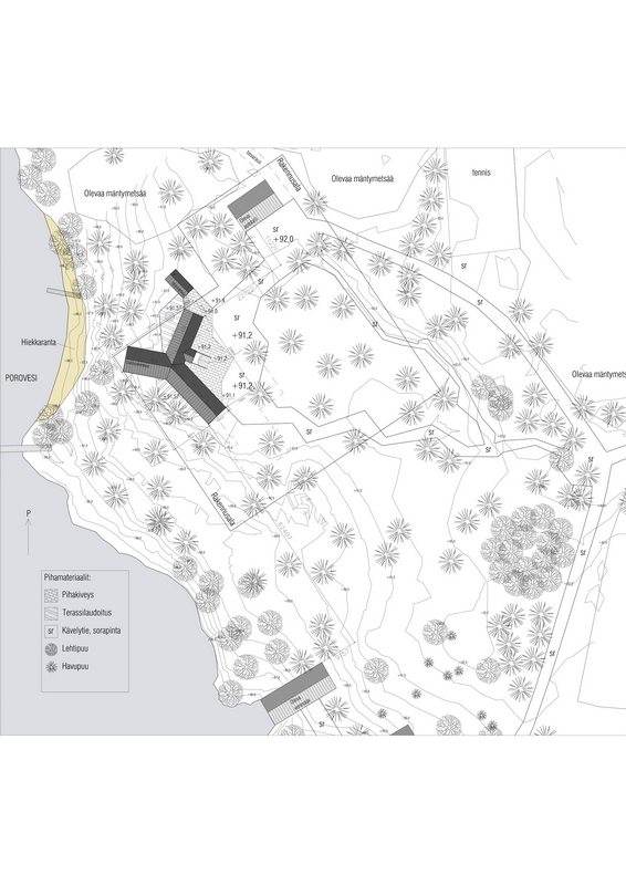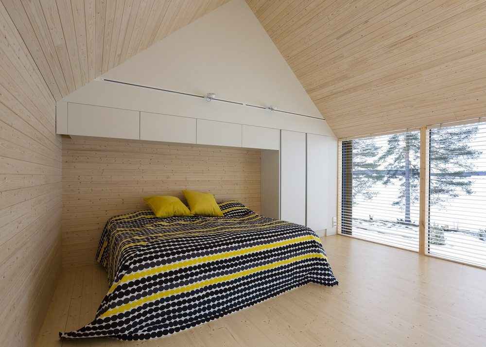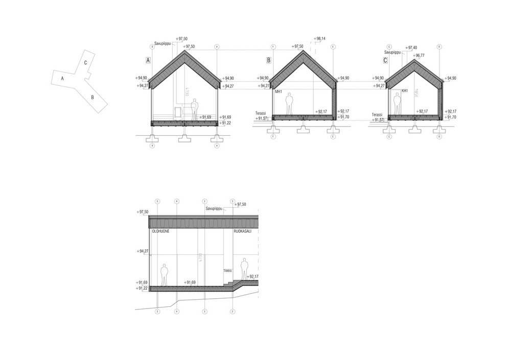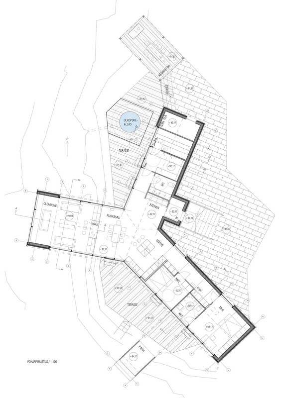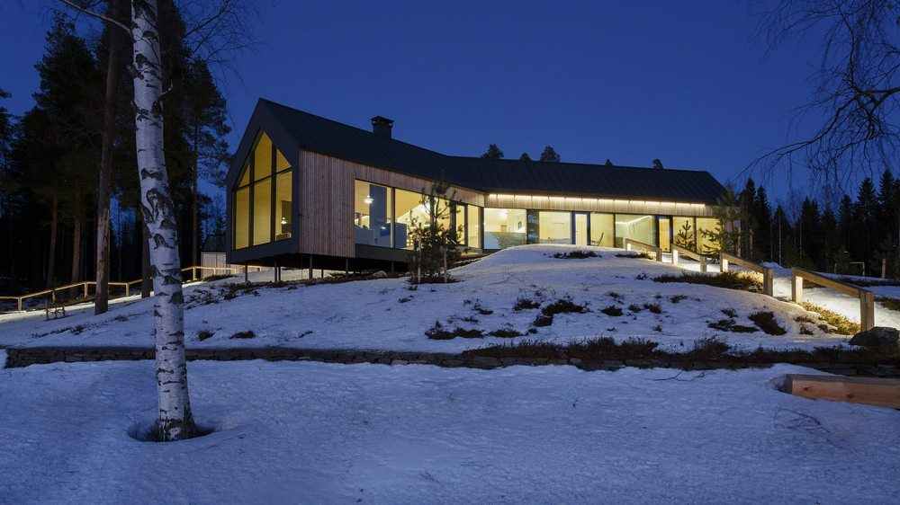 The house and the patio are raised to enhance the experience of the scenery. In doing so the scenery appears even more magnificent and imposing than it actually is. By building the living room as a canopy toward the lake the room appears to be floating above water (when viewed from the interior). You cannot see the shoreline of the plot from inside the living room. There is an exit from every room of the house, so in the summertime the interior and the exterior are truly one.