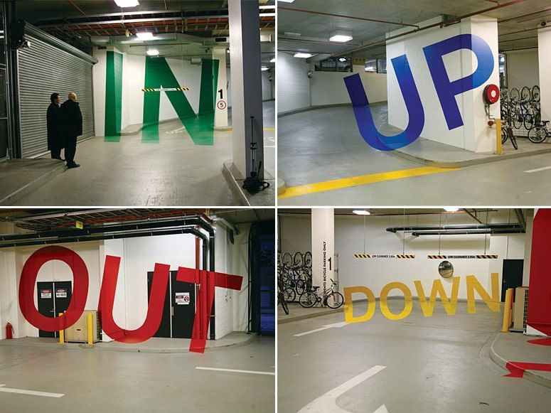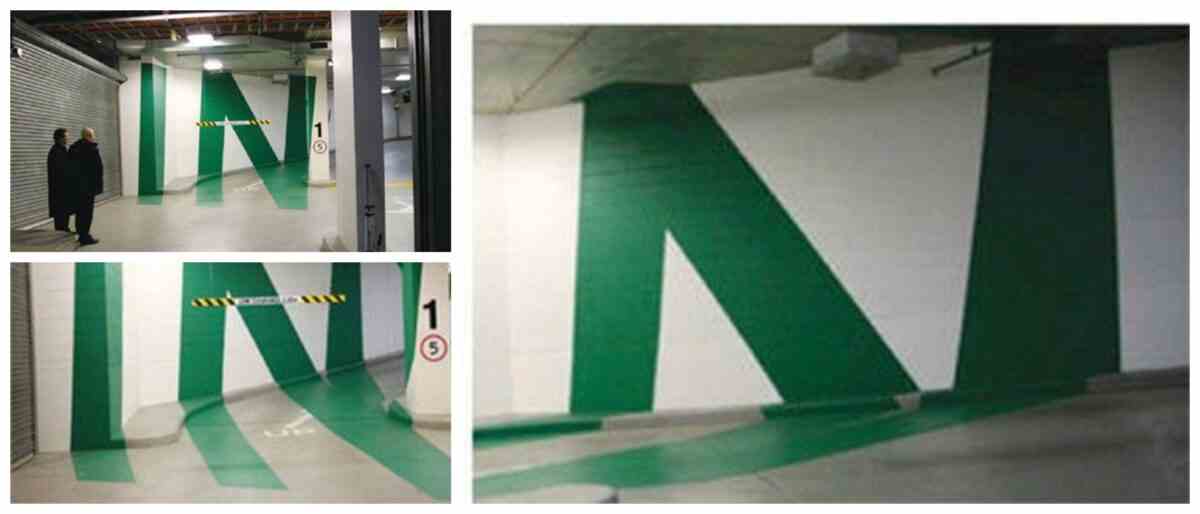 The Eureka Tower parking garage signs, designed by Axel Peemoeller, feature anamorphic signage. This innovative signage system uses perspective to create the illusion of three-dimensional letters and images. The anamorphic signage is highly visible and legible, even from a distance.