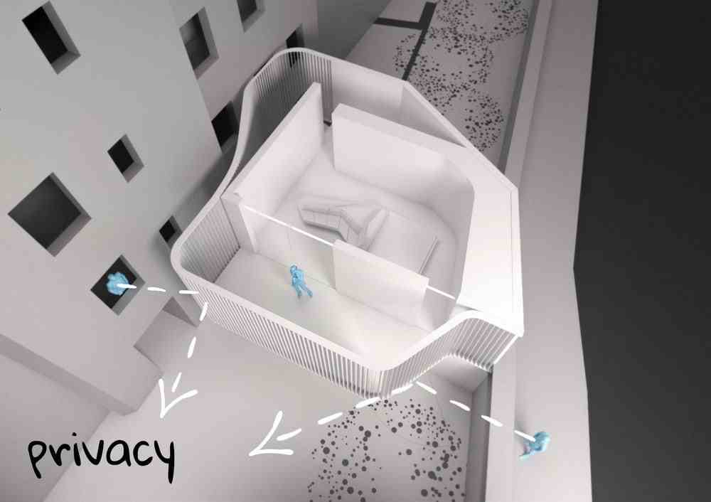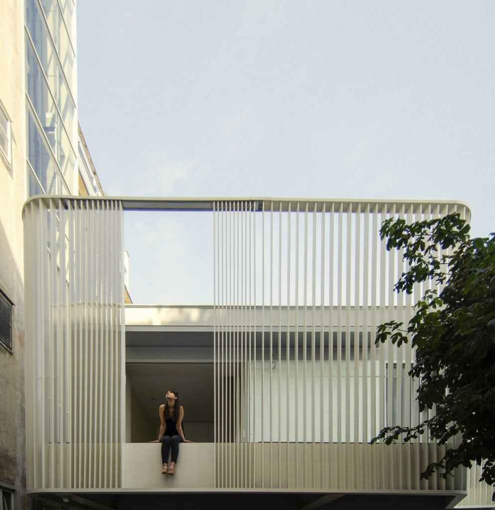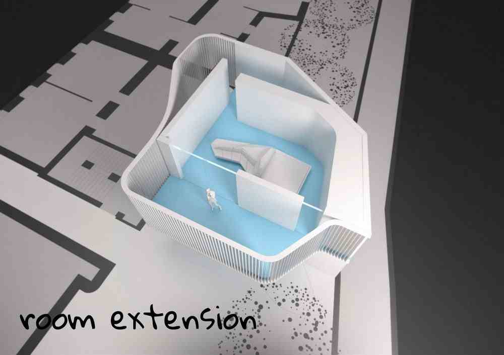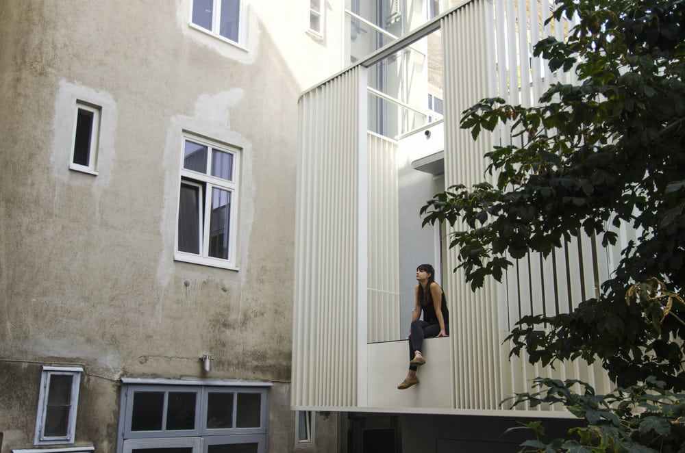 The result is: A small surface can get a huge room! Outside we put a small terrace on the top of the house and keep this in an elegant dress of fins. The resulting room outside doubles the 35m2 one-room-apartment and let the flat be an introverted refugium. The lamellae keep away snoopy looks from outside and tries to orientate the outside-room to the inside, they nuzzle and hug the spiral stairs that are also the beginning of the rooftop terrace. There you can enjoy an unforgettable view to the unmatched museums – old ones and new ones.