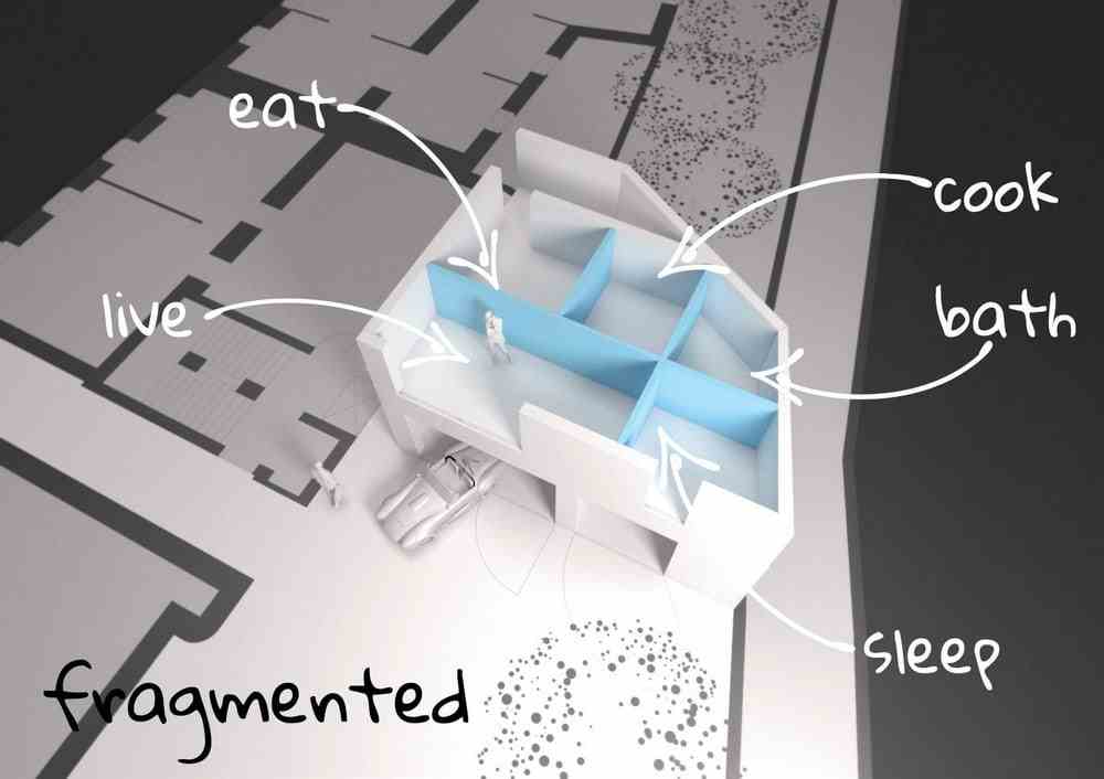 In a single enchanted courtyard right behind the Museumsquartier (English: museum´s accommodation) we have resuscitated a small, romantic house of a coachman. Back then the coachman had to divide his small living area with the animal’s food chamber and his own space was also split up corresponding to the different functions of eating, sleeping, washing and living, so it was divided into smaller rooms again. One hundred years later we combine eating, sleeping and living in one central island of living. The bathroom, the kitchen and the storage are placed in a double function wall and are kept to a minimum.