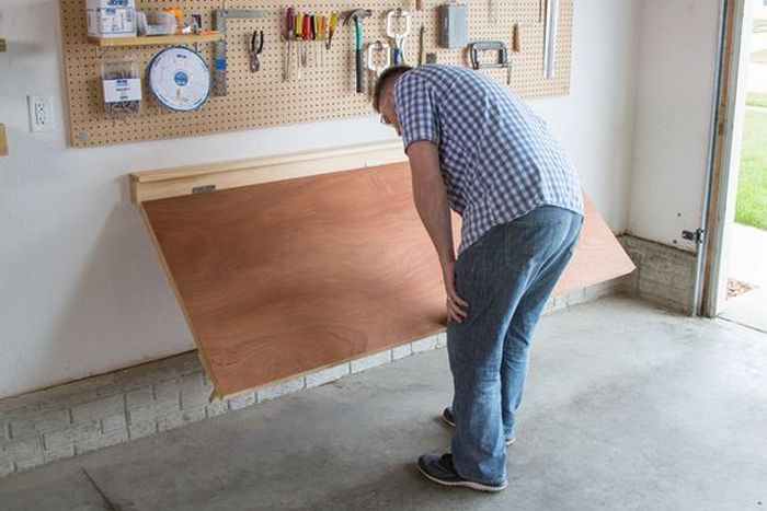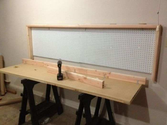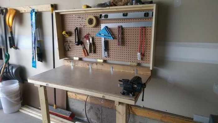 He decided to use the wall space in his garage as a workbench. The problem is that the garage doesn’t have extra space when the vehicles are inside.