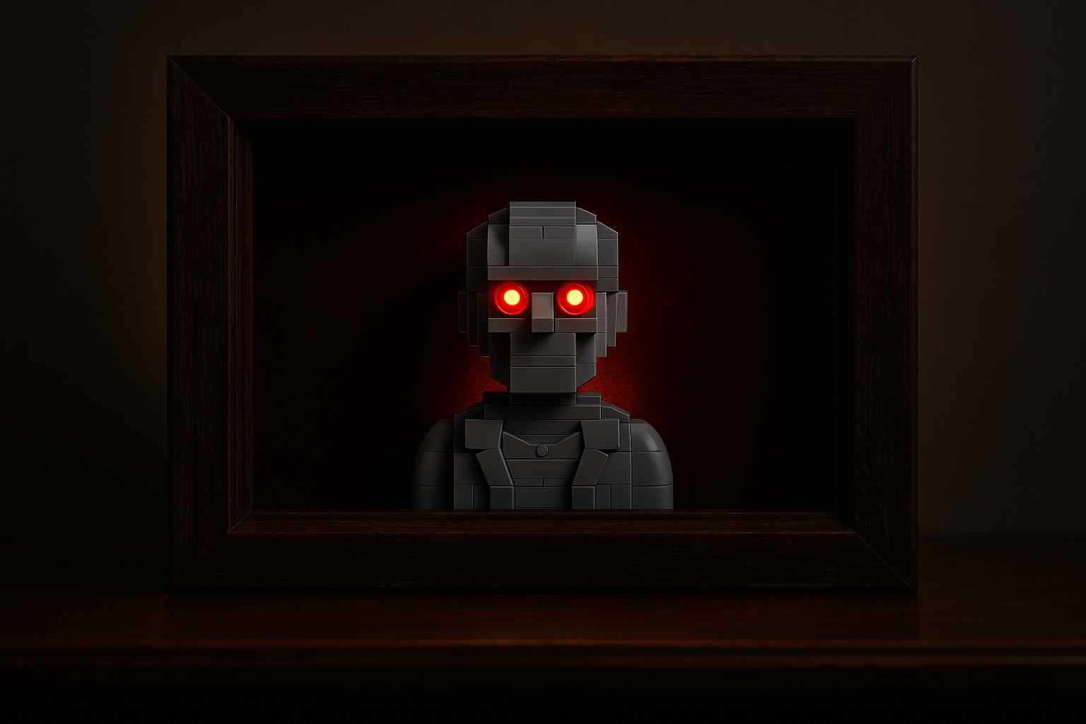Build an eerie portrait with glowing eyes inside a shallow frame. A dark background, halos, and tidy cable management deliver gallery-like finish that sits safely on mantels, shelves, or walls.