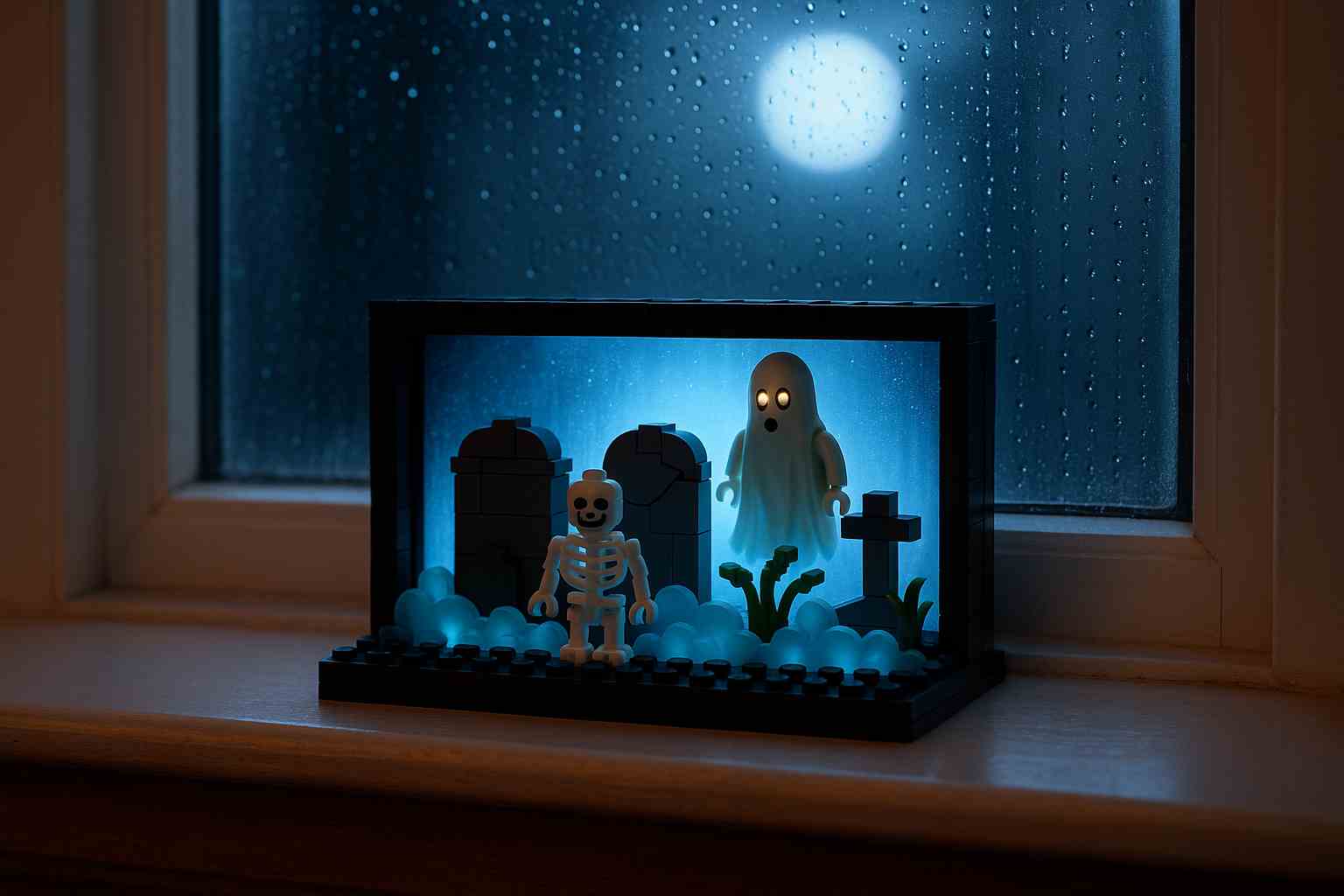 Windows create dramatic backlight for ghosts, gravestones, and jack-o’-faces. Stage a shallow scene on a baseplate that fits the sill depth. Place LED light along the rear edge facing the glass for a halo. Secure the base with removable putty so bumps don’t send parts flying. Close curtains halfway to frame the scene. The result feels theatrical and keeps your LEGO Halloween vignette safe from drafts.