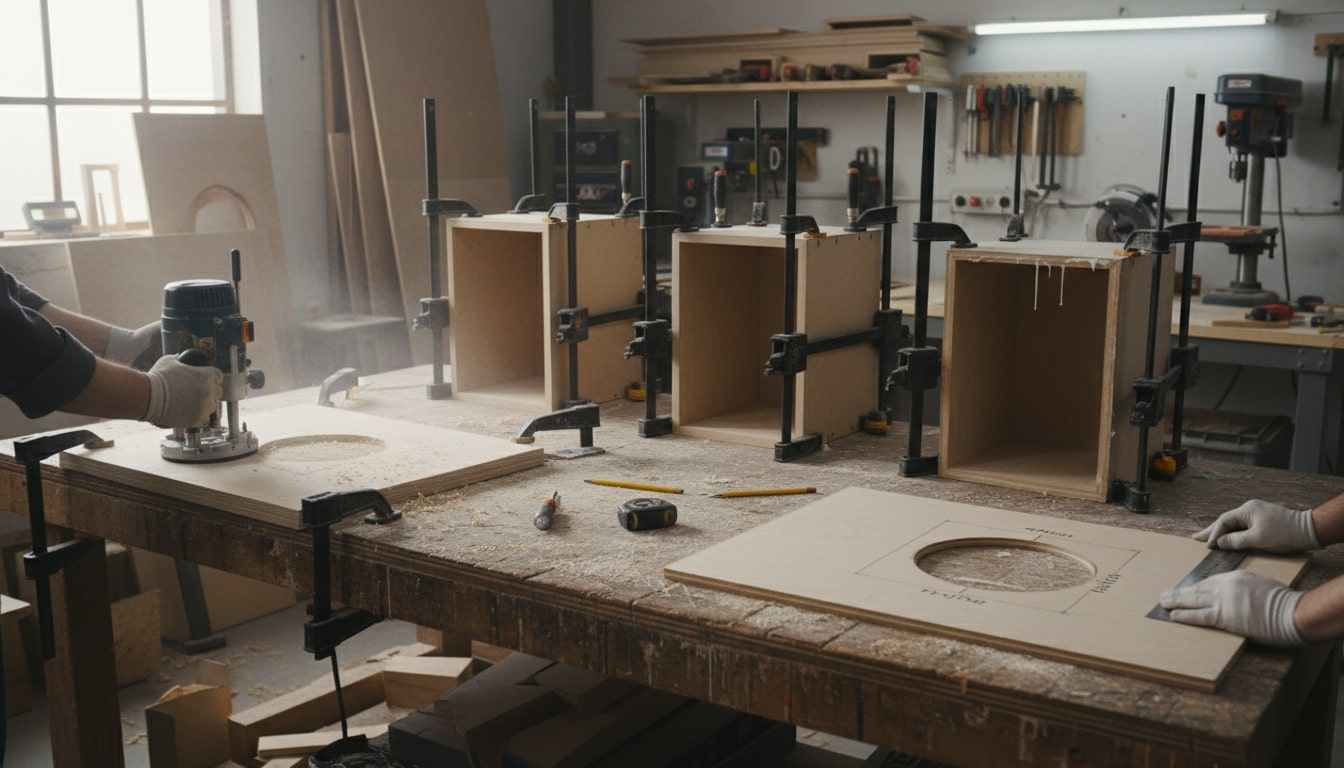 Mark the center points for your woofer and tweeter on the front baffle. Use a router with a circle cutting jig or a jigsaw to cut precise holes matching your driver dimensions. The tweeter should be positioned in the upper third of the baffle, with the woofer centered below.