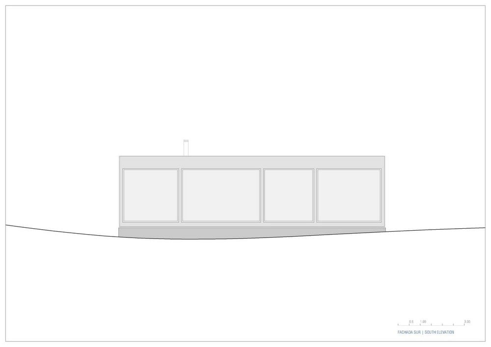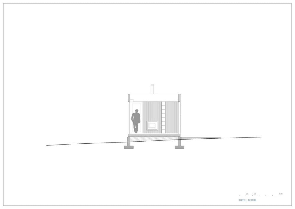 The view towards the landscape, fixed windows that allow a maximum vision with minimum restriction. The perspective causes that when one moves through the interior, it seems to be floating from the ground, without touching it, without getting wet and alien to the cold or the heat. An extreme feeling of Refuge. Refuge + Landscape = Refuge in the Landscape.