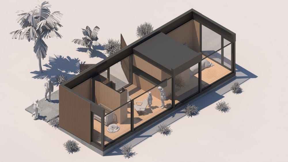 Each module is developed in 518 sq ft. (48 m2) It was designed to house, a single person, a couple or couples, families, friends, cousins, in short, flexible to any inhabitant. The interior is subdivided into 3 defined spaces, but without doors that separate them, allowing to break with a traditional concept of delimiting the interiors and thus emphasize the connection between people. The spaces are defined by two bedrooms, a living room or intermediate space, a kitchenette and a bathroom.